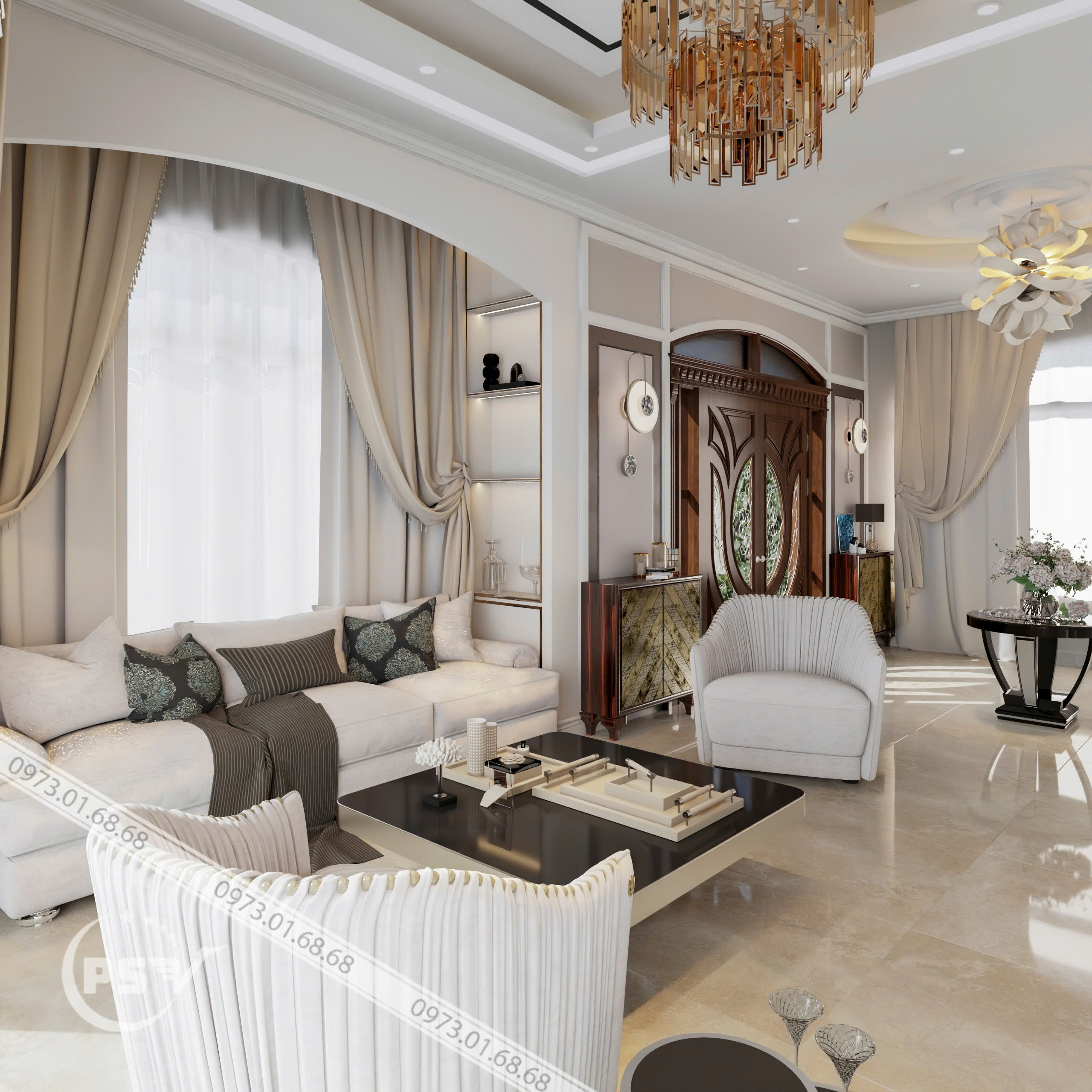 Nội thất phòng khách đòi hỏi sự thông thoáng, thoải mái nhưng cần phải đảm bảo sự hài hòa, cân đối với diện tích ngôi nhà. Với tông màu trắng hiện đại căn nhà toát lên vẻ sang trọng nhưng vẫn ấm cúng từ chiếc đèn chùm, cùng với bộ sofa trắng, rèm trắng và những thiết kế decor tông màu trắng tạo nên cảm giác sang trọng hơn.